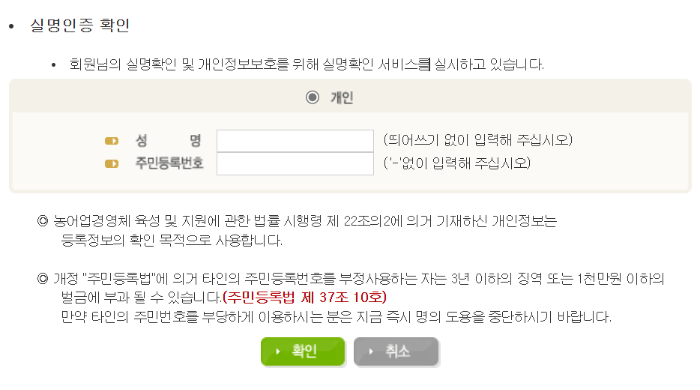 ▶ 먼저 농업경영체 등록 온라인 서비스 - 농업경영체등록 신규신청(아래그림)화면으로 들어가셔서 본인 인증합니다.