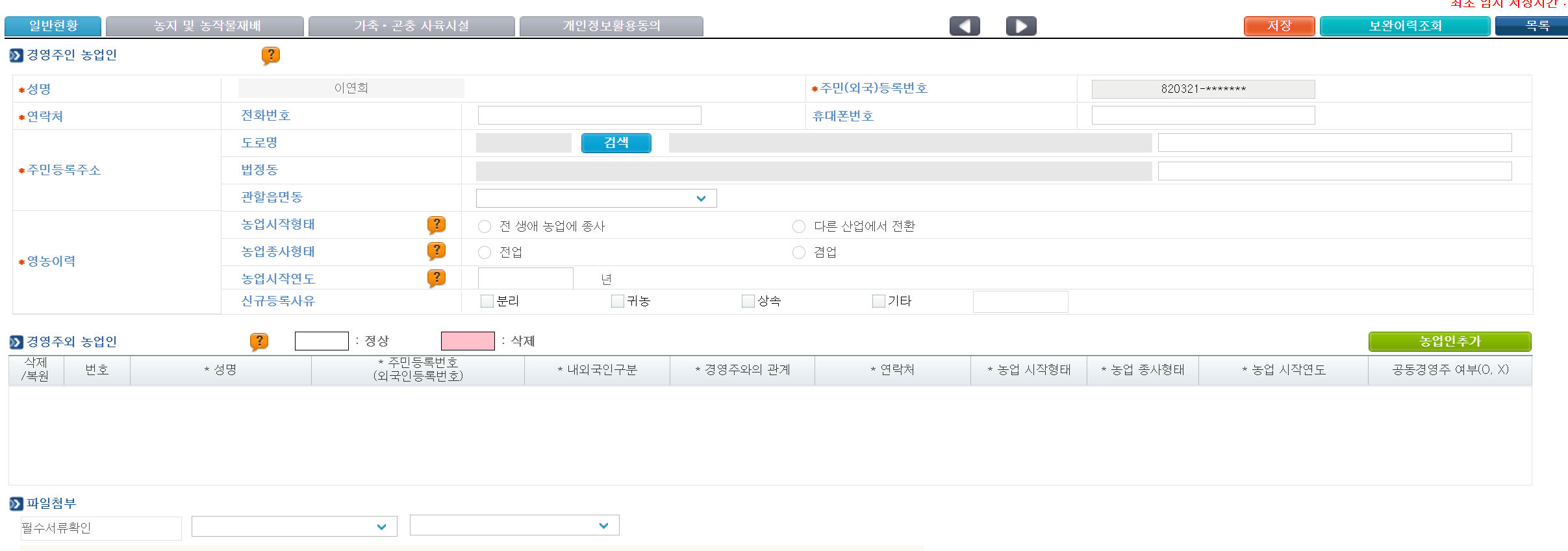 ▶ 아래 등록 신청화면에서 일반현황/농지 및 농작물재배/가축,곤충사육시설/개인정보활용동의 순서대로 입력하신 후 구비서류 첨부하셔서 신청하시면 됩니다.
