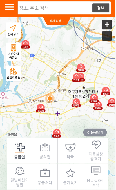 E-gen 앱으로 접속하시면 내 주변의 응급실, 병의원, 약국이 직관적으로 보여 앱 활용을 더욱 추천드립니다.