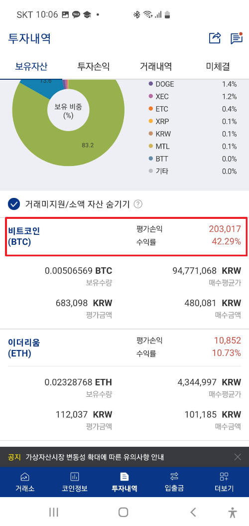 • 오른쪽 그림: 거래가 완료되면 투자내역에서 보유 자산에 비트코인이 추가된 것을 확인할 수 있습니다.