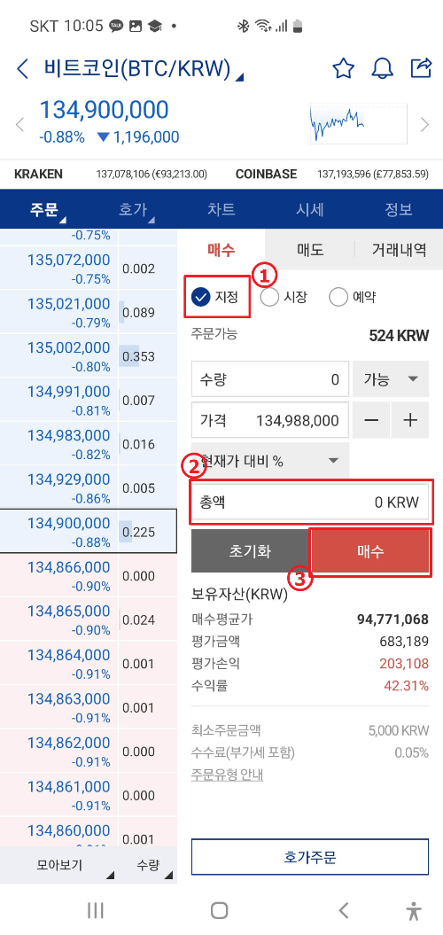 • 가운데 그림 : 지정가로 체크한 후 현재 총액에서 현재 비트코인 가격보다 조금 낮은 금액으로(또는 원하는 금액) 입력하거나 시장가로 체크하여 현재 시장가격으로 즉시 매수할 수 있습니다.