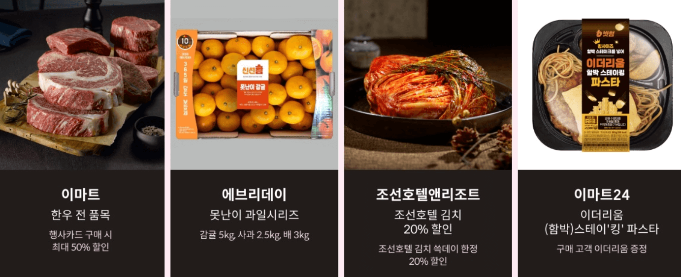 ✔️ 한우 전 품목 행사카드 전액 결제 시 최대 50% 할인 : 평소 가격이 부담스러워 많이 구매하지 못했던 한우를 반값에 가져갈 수 있는 기회입니다. 이번 기회에 사랑하는 가족에게 마음껏 선물하세요!