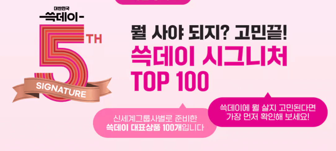 시그니처 톱 100상품을 구매하는 고객에게 구매 금액의 최대 50%를 돌려주고 5억원 상당의 경품을 증정하는 이벤트와 쓱데이 마지막날까지 행사 일정을 가까운 지인에게 공유하면 100억원 상당의 비트코인 100% 당첨권을 받을 수 있습니다. 카톡 등에 공유만 하면 100% 지급되니 지금 당장 진행해 보세요