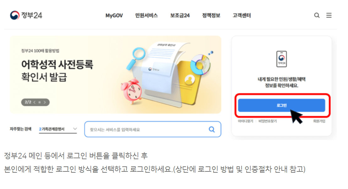 1) 정부24에 접속하여 로그인합니다. (로그인 없이 비회원도 발급가능합니다)