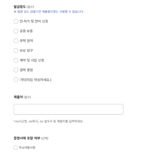 4) 발급용도를 체크하고 제출처를 입력합니다.