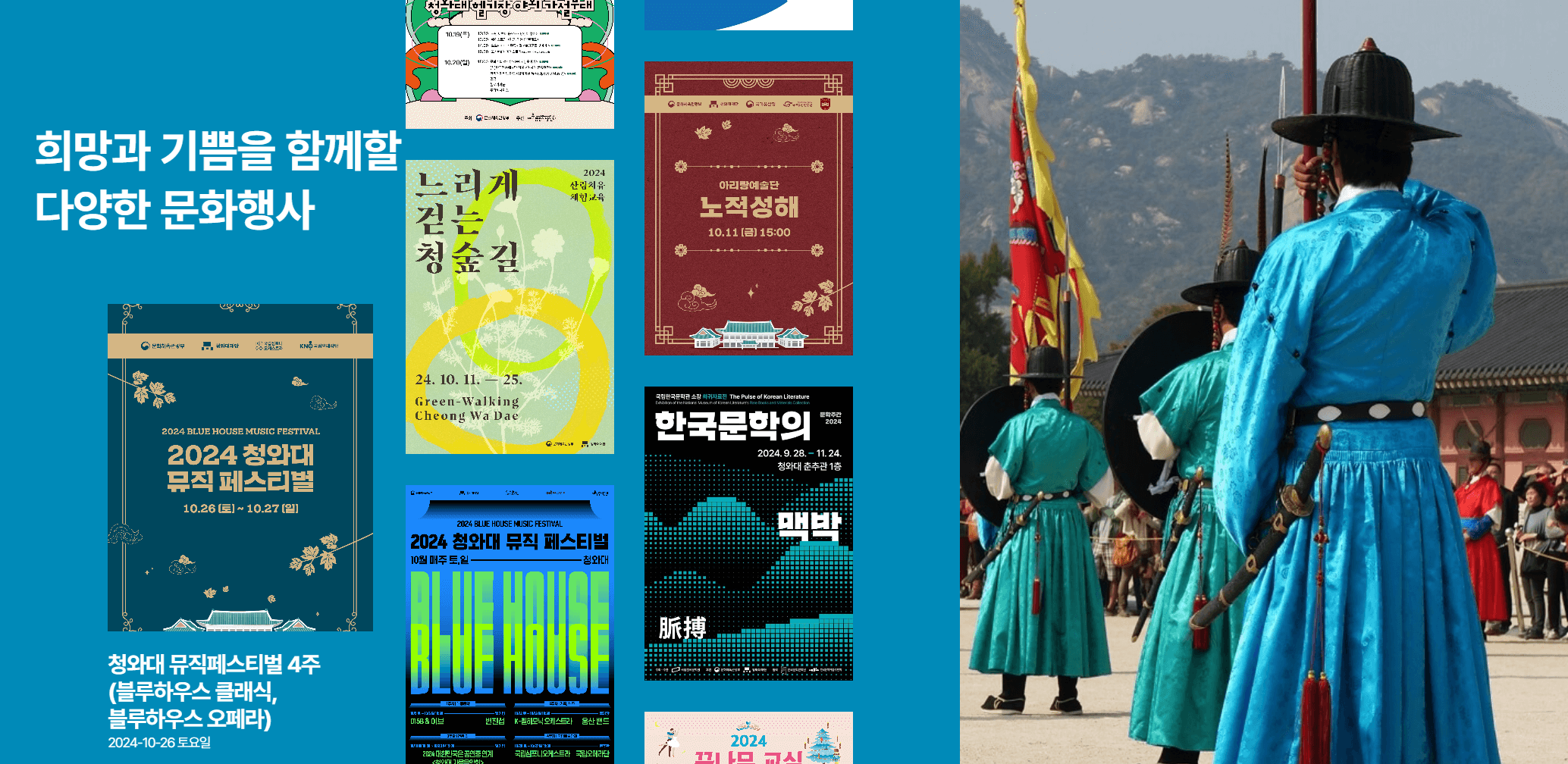 청와대에서도 가을을 맞아 다양한 문화예술 프로그램을 진행하고 있는데요, 특별한 장소에서 이루어지는 공연과 전시는 더욱더 기억에 남게되죠 저도 아이들과 이런곳을 방문하면 꼭 공연이나 체험프로그램을 찾게 되는데요 아래에서 다양한 프로그램을 확인할 수 있으니 마음에 드는 프로그램이 있다면 해당일에 방문신청을 하는 것도 청와대를 관람하는 한 방법이 될 것입니다.